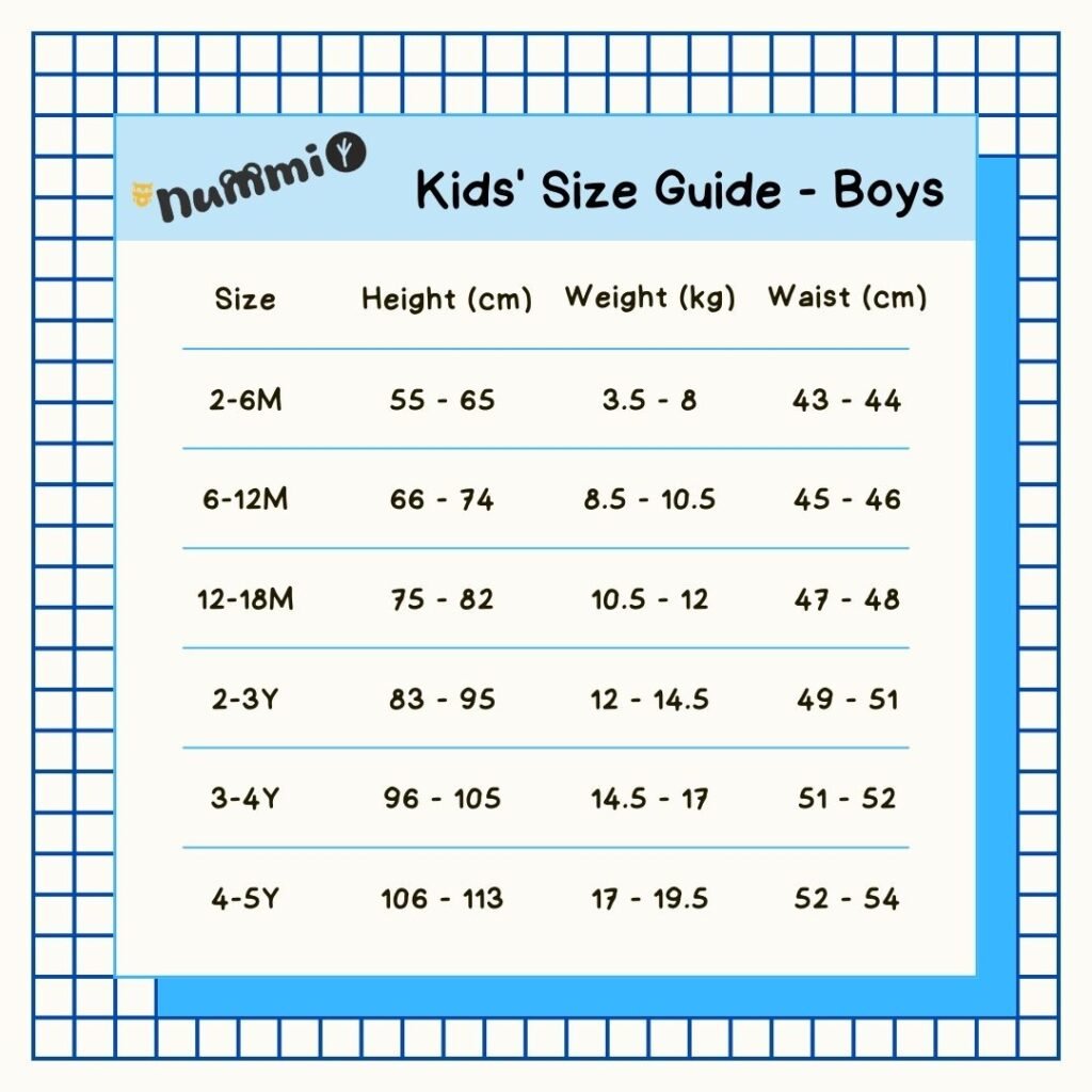 By using these size charts, you can easily select the best fit for your child, ensuring they look great and feel comfortable in their Nummiy clothing.