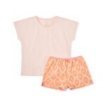 Fresh, fun, and effortlessly comfy — the Peach Glow Sleepwear Set features a light blush top with relaxed cap sleeves and playful ikat-print shorts in sunset shades of peach and coral.