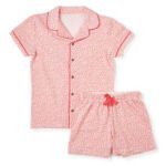 Bursting with personality, the Strawberry Pounce Sleepwear Set features a bold pink leopard print on a classic short-sleeve button-up top and matching shorts.